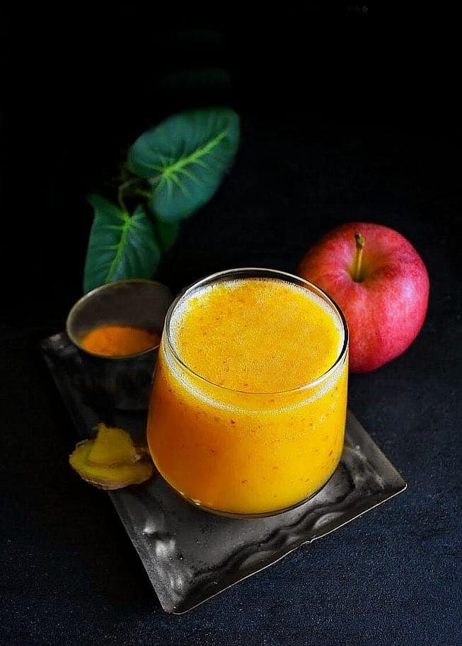 5 Karotten, 1 roter Apfel, 1 rote Beete, 1 Tomate, 1 Stück Ingwer (daumengroß), 1EL Maca Pulver, 1TL Guarana, 1EL Schwarzkümmelöl, 200ml kaltes Wasser